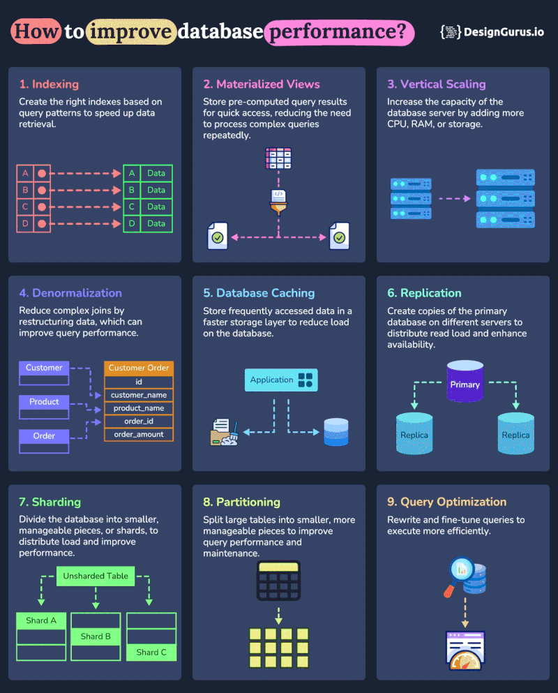 以下は、データベースのパフォーマンスを向上させるための主な方法です: https://docs.hoctran.io/database_performance.html Source: https://www.linkedin.com/posts/arslanahmad_systemdesign-databases-interviewtips-activity-7350932615606005760-g8qi/