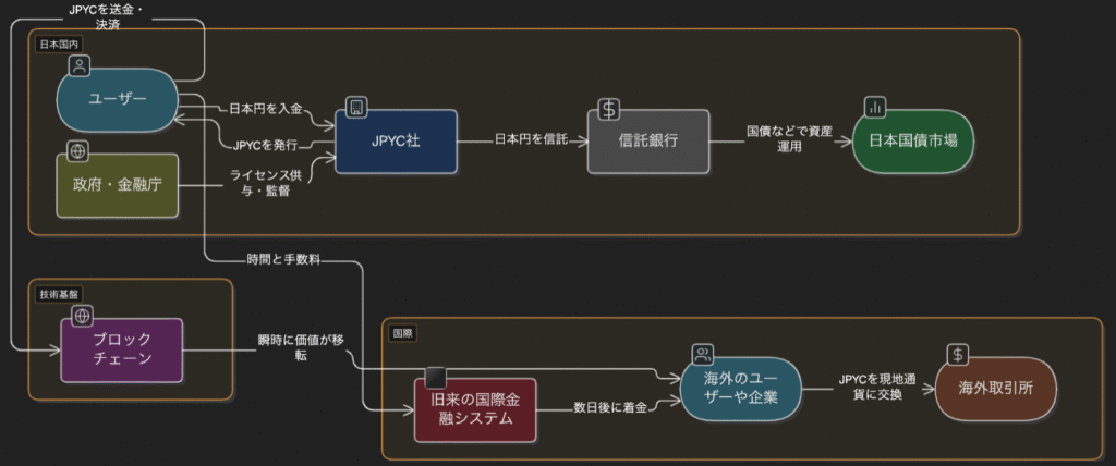 **法律に準拠した発行体(JPYC社)が信頼を担保し、それを基盤に「送金・決済の効率化」「金融市場への影響」「新サービスの創出」**という巨大な変化を引き起こします。